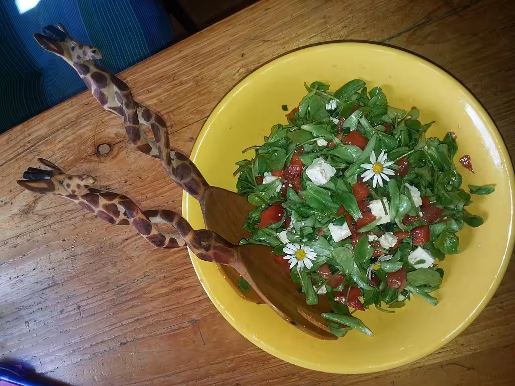 Feldsalat vom Herbst, der gerade anfangen will Blüten zu treiben, aber er muss jetzt der neuen Aussaat weichen. Winterpostelein, junge Gierschblätter, Löwenzahnblätter, Schafgarbe und Gänseblümchen stehen reichlich auf dem Rasen!